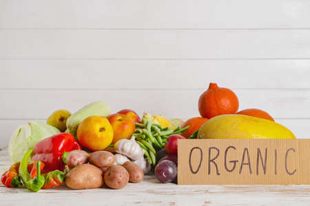 word organic on an abstract background with fruits and vegetables, healthy food concept