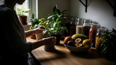 A woman prepares food in a sunlit kitchen, surrounded by lush plants and a bowl of fresh fruit. Jars of preserves line the counter. The scene evokes a sense of tranquility and healthy living. Soft natural light illuminates the scene.