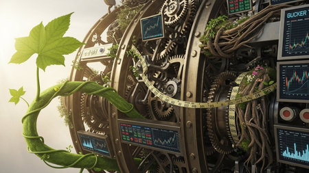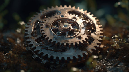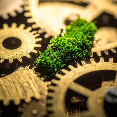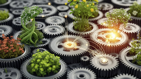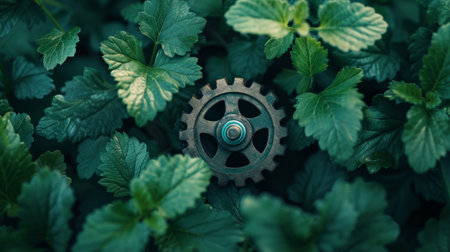 An artistic representation features intricate gears interconnected with vibrant plants. The image showcases a contrast of mechanical elements with natural foliage, rendered with detailed textures and lighting. This composition suggests concepts like environmental progress, sustainable systems, or technological advancement, suitable for editorial and commercial applications.