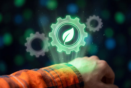 A glowing green gear hologram with a leaf symbol floats above the wrist of a man in a plaid shirt representing sustainable technology and modern eco friendly industrial innovation.