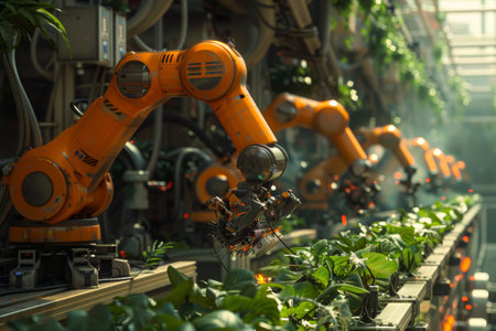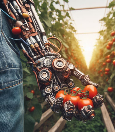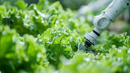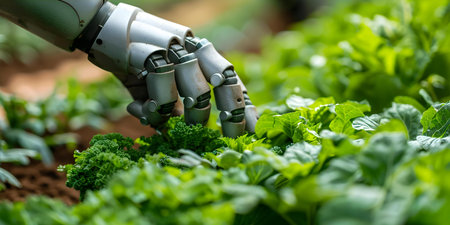 A modern robotic hand carefully tending to young plants in a high-tech greenhouse. This image illustrates the merging of technology and agriculture for sustainable growth.