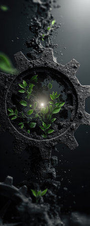 An artistic illustration presents a gear-shaped structure filled with soil, from which vibrant green plants emerge. The image has a dark, moody aesthetic, with a strong contrast between the mechanical element and organic growth. It evokes themes of nature, industrial elements, and potentially sustainable development, suitable for editorial or commercial use.