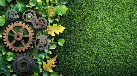 This vibrant image showcases a blend of industrial gears and fresh green leaves on a textured background. It represents the harmony between technology and nature, emphasizing sustainability. Ideal for themes of innovation and ecology.