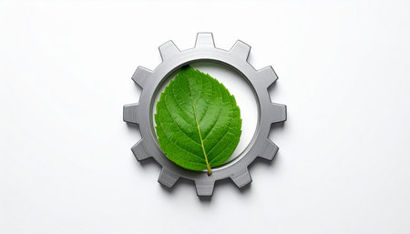 A single metal gear rests on a vibrant green leaf, symbolizing the perfect synergy between industrial innovation and environmental responsibility. This conceptual image represents the future of sustainable manufacturing, green technology, and a circular economy where nature and progress coexist in harmony.