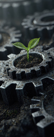 A small plant sprouts from the center of a gear, surrounded by others in a blurred background. The image features a contrast between organic and industrial elements. The composition evokes a sense of growth, representing innovation and development. Suitable for editorial and commercial applications.