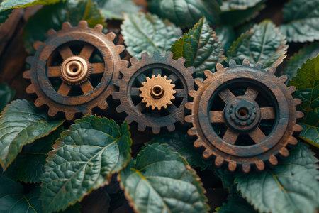 Three interlocking gears in rustic metal tones are juxtaposed with lush, vibrant green leaves, symbolizing the synergy between nature and technology. this image is perfect for illustrating eco-friendly industrial concepts, sustainability, or innovative engineering designs. Generative AI