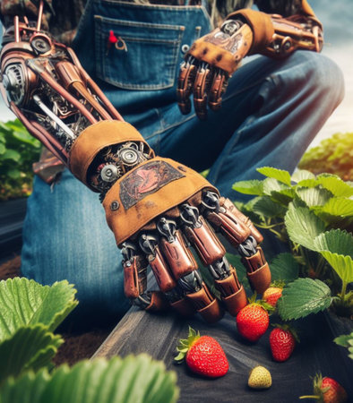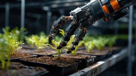A robotic hand carefully plants seedlings in a greenhouse, showcasing the intersection of technology and sustainable agriculture. This image highlights innovation in farming methods.