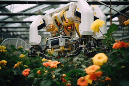 An automated robot nurtures blooming blossoms in a hothouse, epitomizing the marriage of innovation and horticulture, ensuring efficient flower cultivation