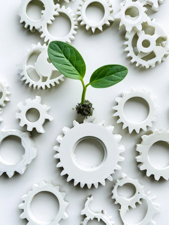 Life Emerging from Mechanisms A Green Plant Grows Through White GearLike Shapes Against a White Background, Symbolizing Growth Amidst Complex Systems