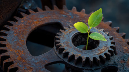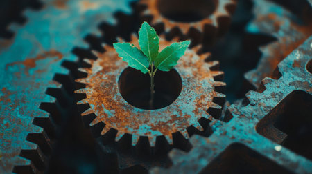 A vibrant plant emerges from a rusty gear, symbolizing growth and resilience amidst industrial decay. This image captures the beauty of nature and innovation.