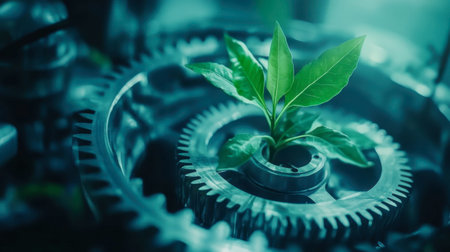 A vibrant plant thrives in the center of a mechanical gear, symbolizing the harmony between nature and technology, representing innovation and sustainability.