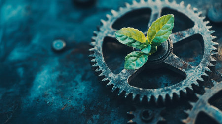A green plant sprouts from a gear, symbolizing the connection between nature and industry. This image captures growth, renewal, and harmony in a mechanical world.