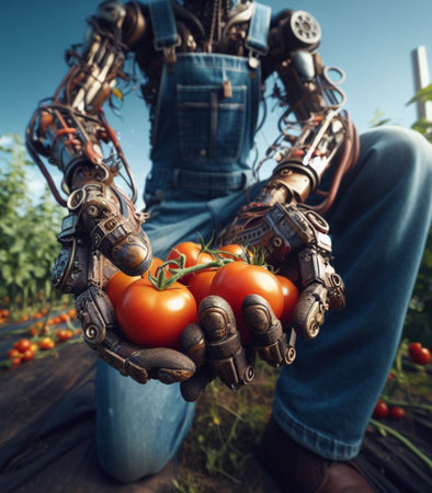 robot working in farm vegetable garden to grow produce for human consumption generated