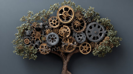 Gears turning and giving rise to a flourishing tree, illustrating the harmony between technology and nature.