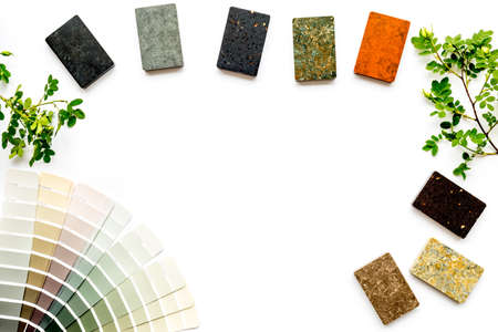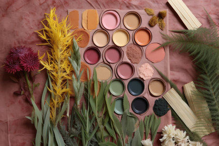 Various paint swatches in rich colors are laid out neatly on a wooden palette. The arrangement showcases shades of blue, orange, beige, and brown against a muted background.