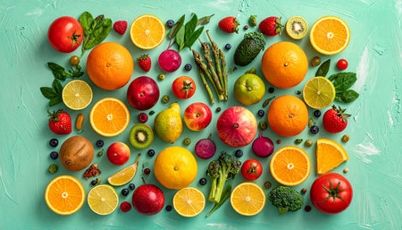 A vibrant flat lay of fresh fruits and vegetables scattered across a teal textured surface.