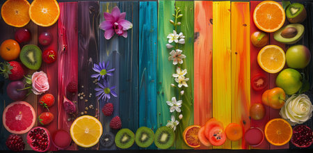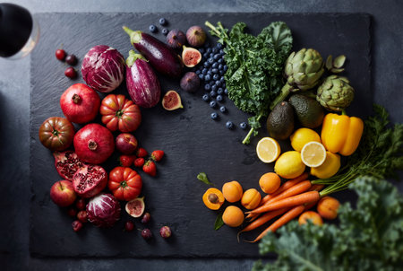 Colorful variety of fruits vegetables arranged in rainbow spectrum food flat lay. Fresh produce arrangement for vibrant healthy nutrition balance diet.
