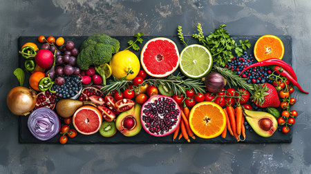 Explore a vibrant collection of fresh fruits and vegetables artfully arranged on a grey table surface. Ideal for promoting healthy eating and organic produce.