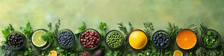 Fresh and healthy ingredients for smoothie or coctails on the green backgrounds wall with copy space.