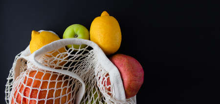 White string bag with fruits on black background. Zero waste shopping concept. Eco friendly lifestyle.