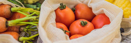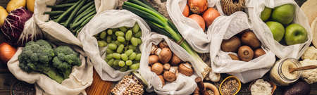 Different vegetables in reusable bags on wooden background. Zero waste concept. BANNER, LONG FORMAT