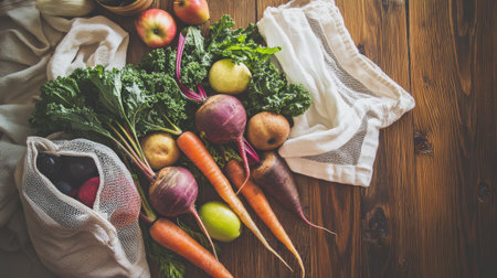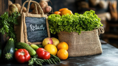 A vibrant display of fresh vegetables and fruits in an eco-friendly setting, showcasing a burlap tote bag and a chalkboard sign. Perfect for promoting sustainable living.