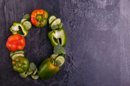 Zero is lined with vegetables in the left side on a black background, broccoli, bell pepper, cucumber, free space for text