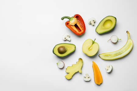 flat-lay of raw seasonal vegetables over white background. Healthy eating concept, vegetarian, vegan, clean eating.