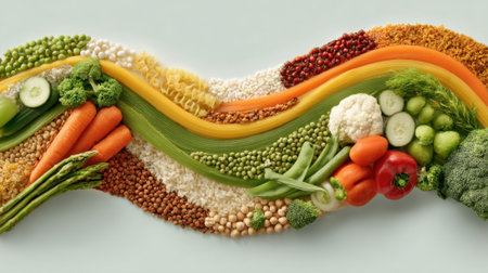 A colorful display of vegetables and fruits arranged in a long line. Concept of abundance and variety, showing the diverse range of healthy food options available