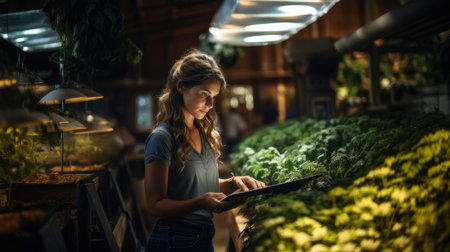 Female farmer using a digital tablet to inspect plants in an indoor smart farm. Modern hydroponic agriculture and technology integration.