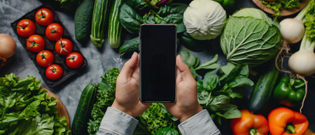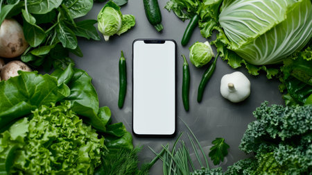 Smartphone surrounded by green vegetables on a dark background. Ideal for healthy eating apps and grocery shopping.