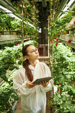 Young female worker wearing protective suit inspecting strawberry plants in vertical indoor farm holding digital tablet, standing among rows of hydroponic greenery, focused on research