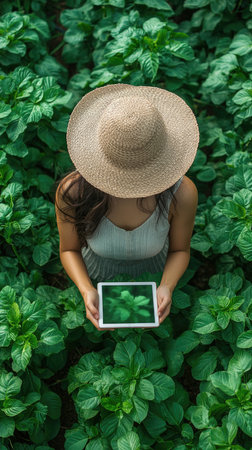 A person interacts with a tablet to identify various plants and manage their garden, showcasing the blend of technology and nature in modern gardening.