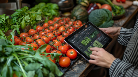 A person selects vibrant vegetables while referencing information on a tablet in a market.
