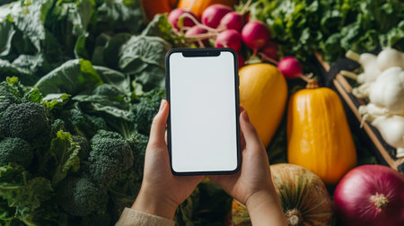 Smartphone screen showcases colorful farm-to-table app with fresh fruits and vegetables. Minimalist design with clean white surface, concept of nutrition, healthy living, and local agriculture.