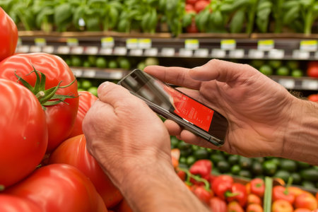 Digital composite of Hand taking picture of beets with mobile phone in grocery store