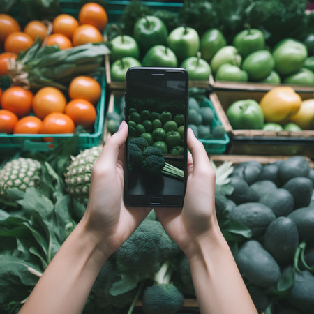 A hand holding a cell phone with a picture of a fruit and vegetable market on it. Concept of abundance and freshness, with a variety of fruits and vegetables on display