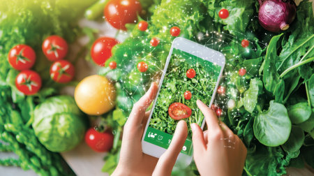 A smartphone captures a colorful arrangement of fresh vegetables and fruits, showcasing the joy of healthy eating and culinary creativity in a vibrant kitchen setting.
