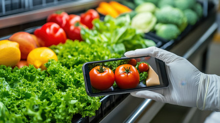 A person in gloves captures a photo of ripe tomatoes nestled in crisp lettuce. The vibrant display showcases a variety of fresh vegetables in a grocery store setting.
