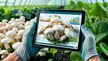 Agricultural engineer analyzing production data on a futuristic digital tablet in a greenhouse