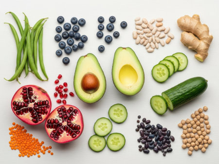A vibrant array of fresh fruits and vegetables including green beans, blueberries, avocados, cucumbers, pomegranates, and various legumes.
