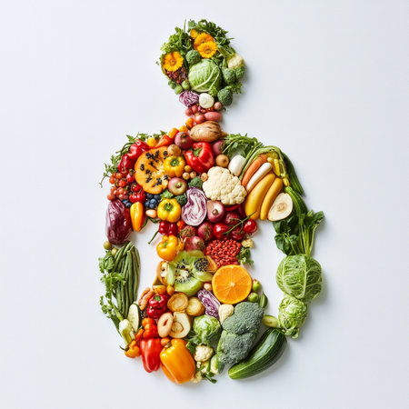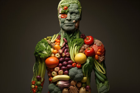 Vibrant human figure formed by diverse fresh fruits and vegetables.