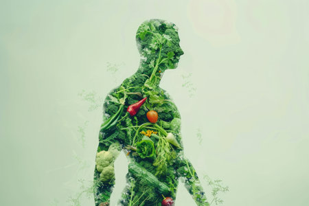 Creative concept, health, vegetarianism, health day. Silhouette of a man on a background of vegetables, double exposure
