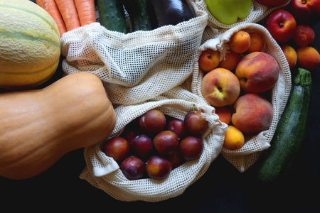 Reusable mesh bags for fruits and vegetables, filled with various healthy food. Dark background, top view.
