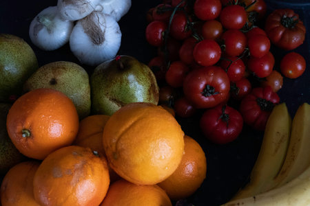 Fresh oranges, tomatoes, and spinach arranged on marble surface create vibrant and healthy composition. bright colors and textures evoke sense of freshness and vitality