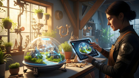 River showing woman using tablet to control holographic terrarium with mountains and river.
