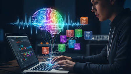Laptop showing woman interacting with holographic brain and music interface on laptop.