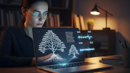 A woman wearing glasses focuses on holographic etymology trees and rhythm meter data on a laptop.