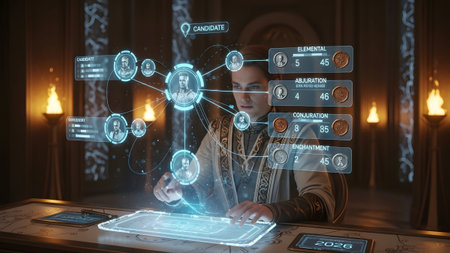 Robes showing man in ornate robes analyzing candidate data on a futuristic holographic...