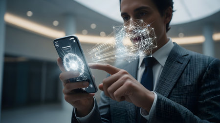 showing man in a suit using a smartphone with a holographic face recognition interface....